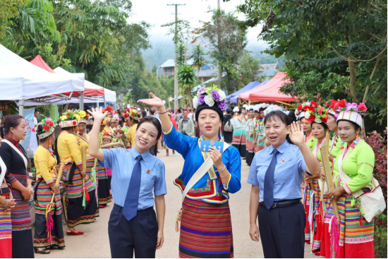 11月11日“禾腊咪”节当天,来自四面八方的宾客汇聚到大渡岗乡大荒坝村委会昆罕大寨,西双版纳检察机关也借此机会与当地少数民族同胞一道载歌载舞、集会赶摆、畅聊生产生活、普及法律知识。前来参加活动的群众热情高涨,纷纷向检察官咨询相关法律问题。