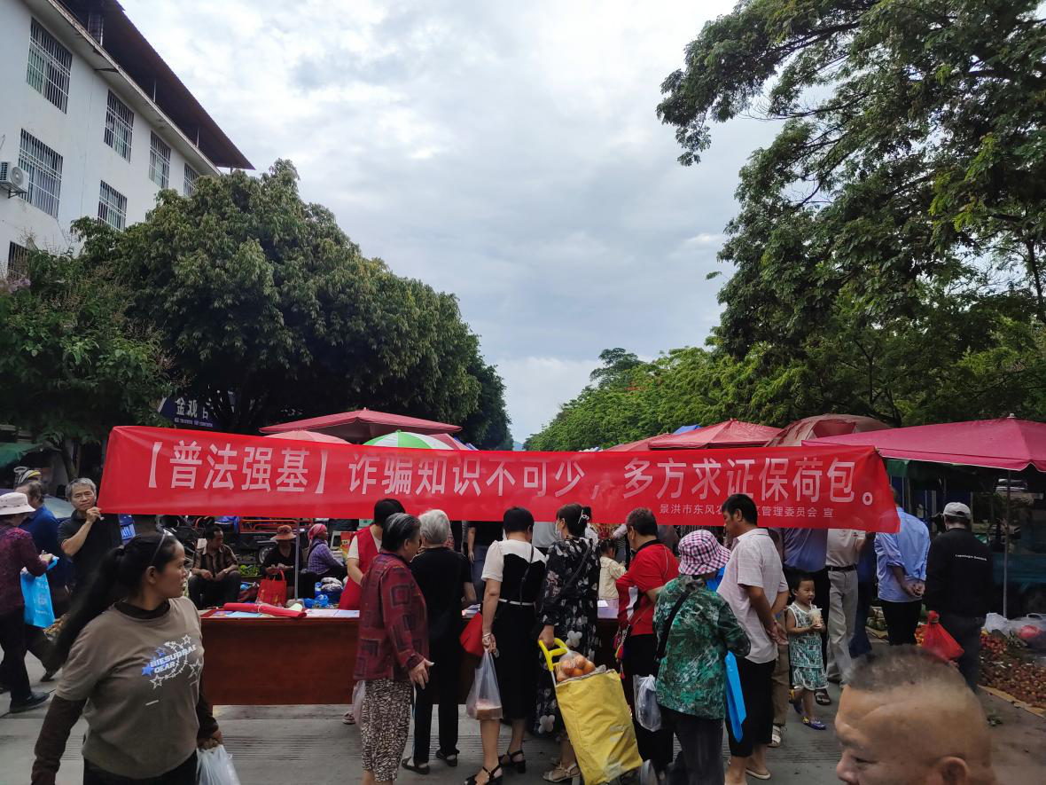 仲夏五月,凤凰花如火焰般绽放,普法宣传同样热情似火,悄然在社区中铺展开。近日,东风农场社区以“法治同行 守护平安”为主题,开展普法宣传进集市活动。