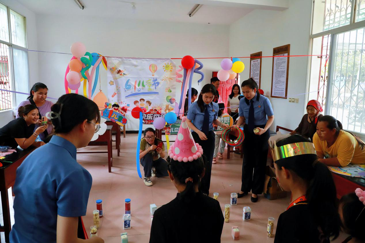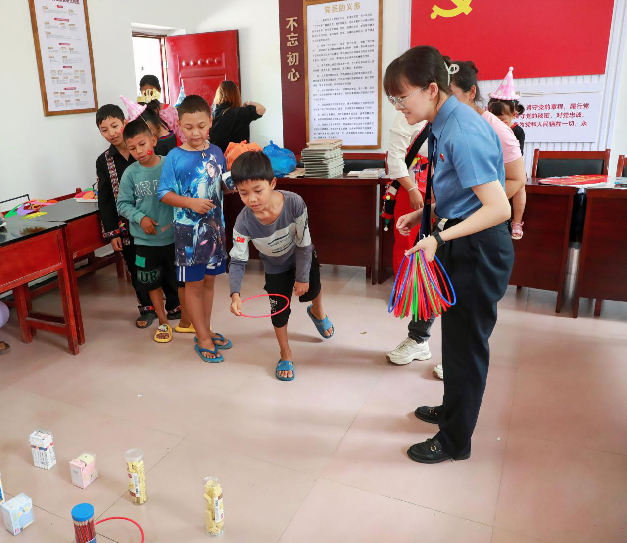 检察干警通过布置五颜六色的气球、琳琅满目的甜品、温馨的环境氛围,让孩子们充分感受到节日的独特氛围。检察干警以游园活动形式开展普法套圈圈、少数民族舞蹈等互动游戏节目,向挂靠的村寨儿童奖励100份“六一”儿童节礼物。在互动过程中向孩子们派发礼品的同时还宣讲如何预防犯罪的法律知识,让孩子在游戏节目中获取更多的法律知识。