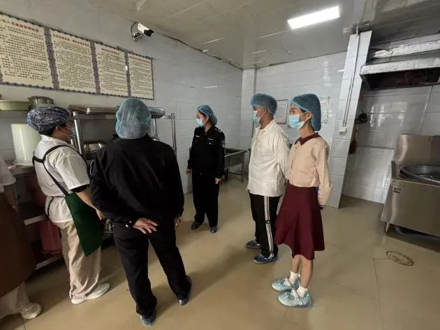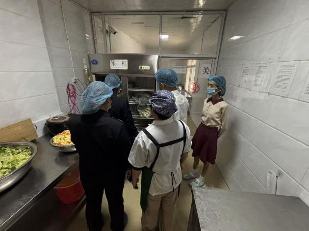 市场监督管理局工作人员来到校内食堂,查验食品经营许可证、从业人员健康证明,核对食品进货台账,并对留样冰箱、餐具消毒设备进行检查。