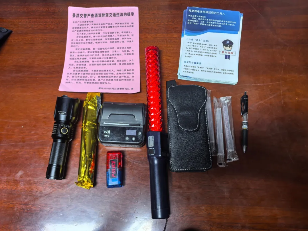 “荧光色和交警是标配,它不仅具有安全提示作用,用起来很方便。”丁鹏自豪地说,这个看似普通的荧光色挎包,拉开拉链,包里微型打印机、测量卷尺、酒精检测仪、笔记本、交通安全宣传册等一应俱全,藏着满满的“大学问”。“农村交通管理讲究灵活便捷,这个包就是我的移动办公点。”丁鹏笑着说,挎包的荧光色是自己特意挑选的,不仅在白天醒目,夜晚的反光条在车灯下能瞬间亮起,在巡逻时,村民也能远远就能看见,既方便开展工作,也能起到警示作用。