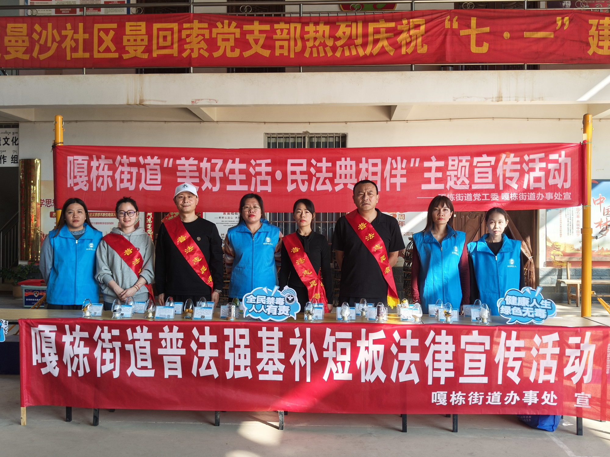 在元旦来临之际,为进一步提升辖区广大群众的法律意识,营造浓厚的法治氛围,2024年12月27日,嘎栋街道平安法治办联合嘎栋司法所、景龙社区以“中华民族一家亲 欢天喜地庆元旦”辞旧迎新文艺汇演活动为契机,到曼回索村民小组开展普法强基补短板法律宣传活动。
